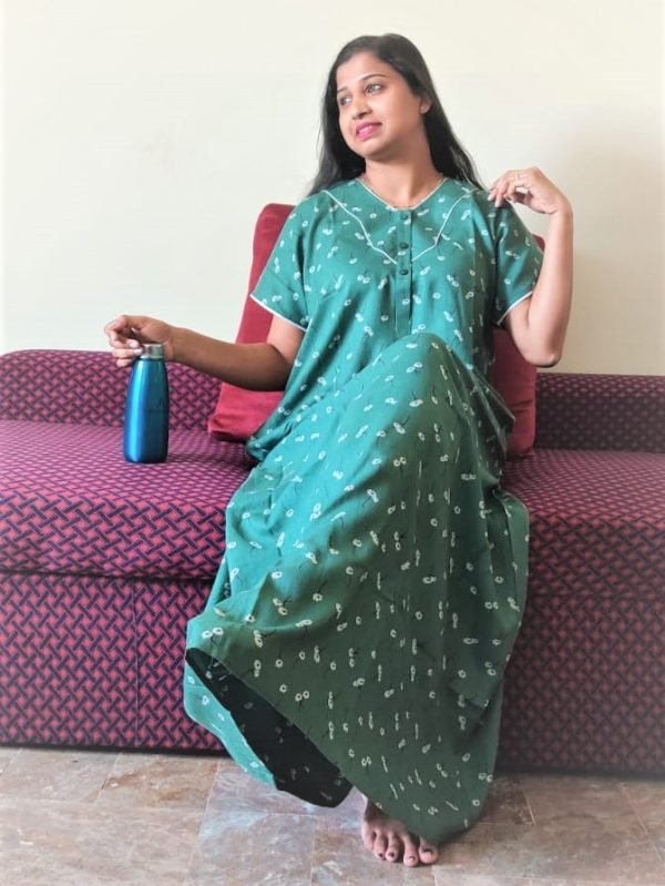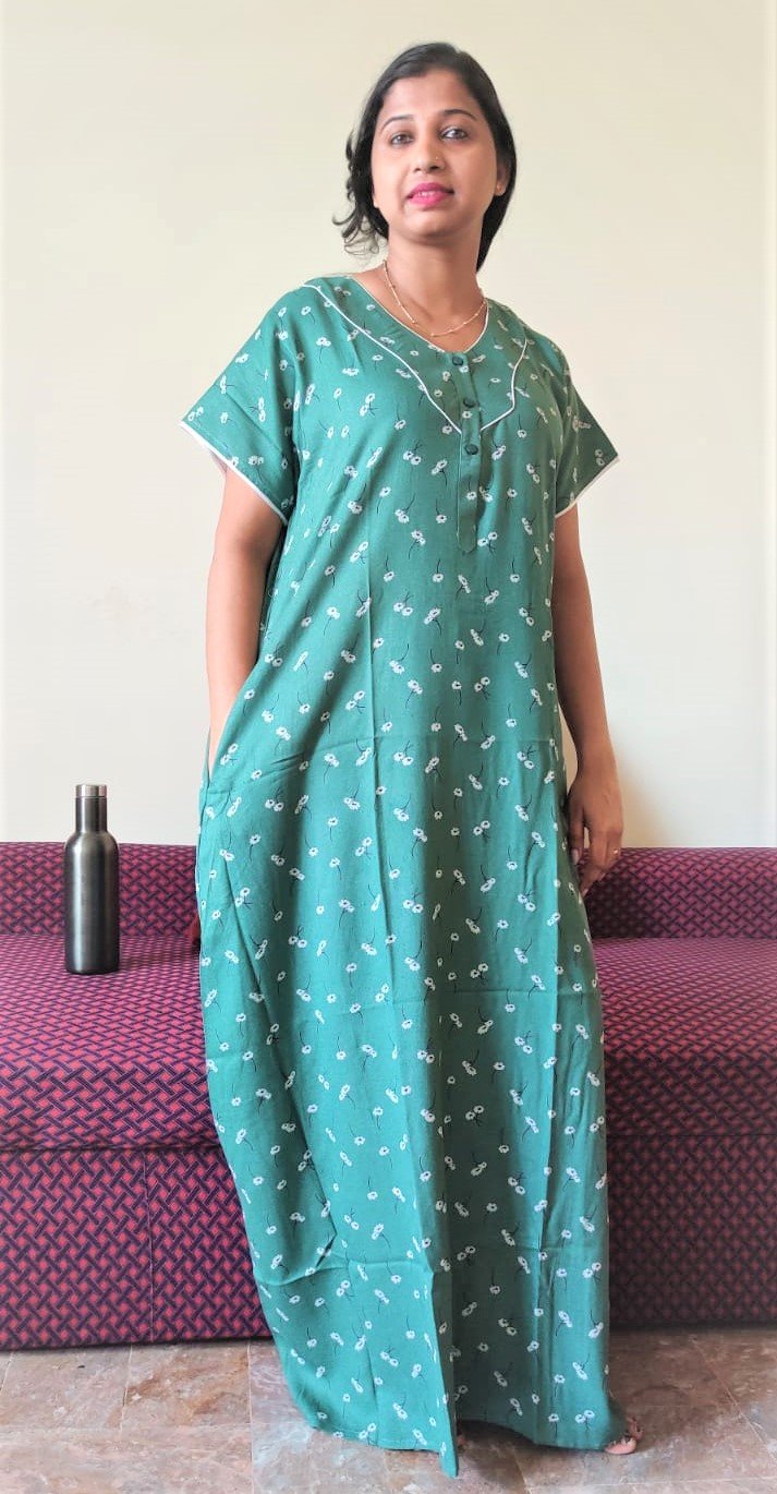 This delicately embellished rich long Printed night dress for a sweat-free comfort all night long. This is a perfect pick for women who are fond of stylish nightwear. This Half sleeved nighty is a must-have for your nightwear needs. Made with 100% soft cotton to keep you cool all throughout. This beautiful nighty comes in free size and completely. The stylish flow makes it a great combo for women of any age and any body type!