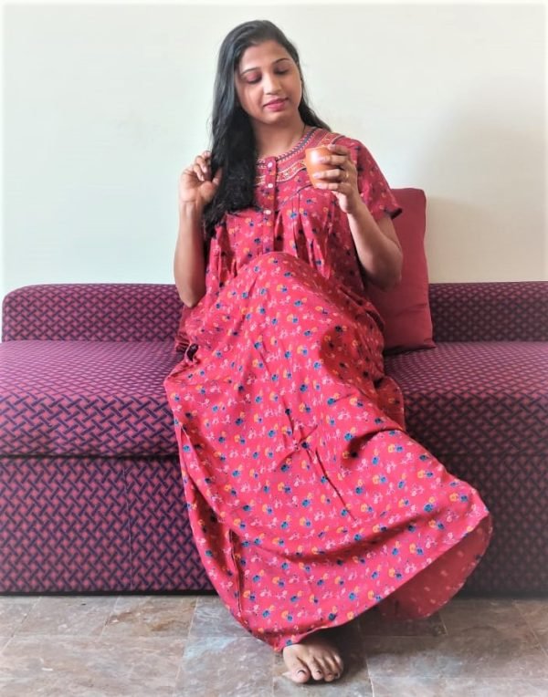 This delicately embellished rich long Printed night dress for a sweat-free comfort all night long. This is a perfect pick for women who are fond of stylish nightwear. This Half sleeved nighty is a must-have for your nightwear needs. Made with 100% soft cotton to keep you cool all throughout. This beautiful nighty comes in free size and completely. The stylish flow makes it a great combo for women of any age and any body type!