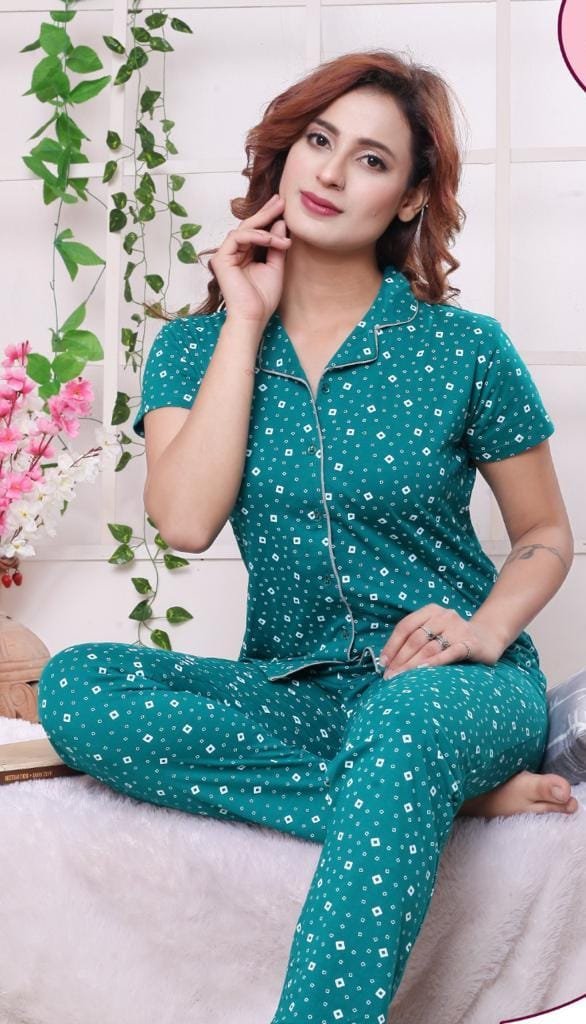 Arjey’s Women’s Cotton Printed Night Suit Set of Half sleeves Front Open Shirt with Pyjama – Sea Green