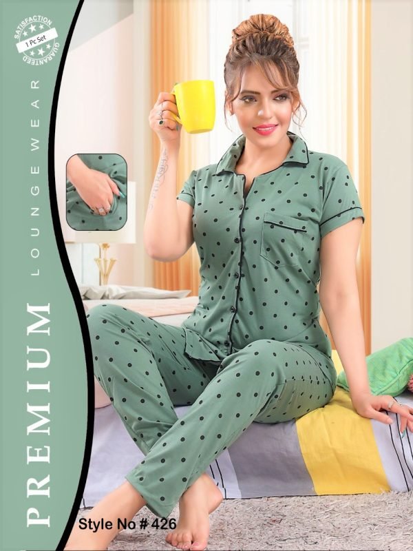 Arjey’s Women’s Cotton Printed Night Suit Set of Half sleeves Shirt with Pajama – Light Green