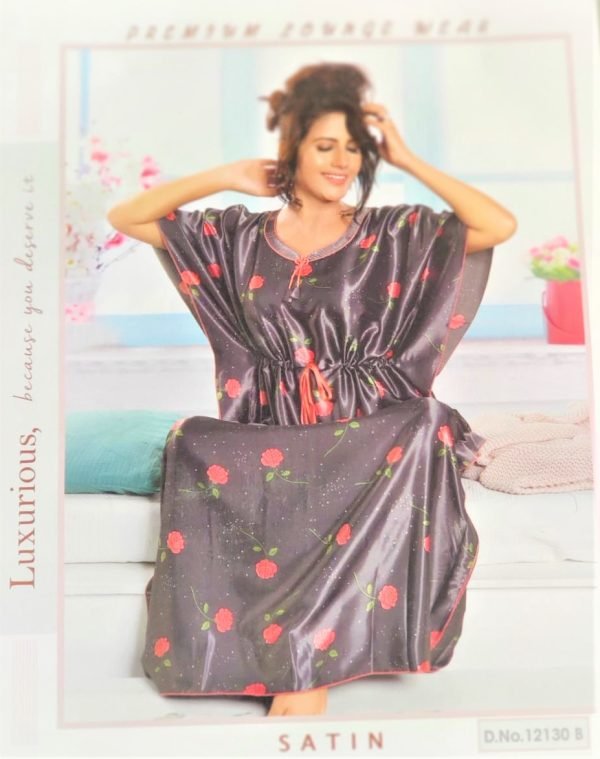 Arjey’s Women’s Satin Printed Kaftan Long Full Length Nighty Super Soft and Comfortable Design – Grey with Peach Flower