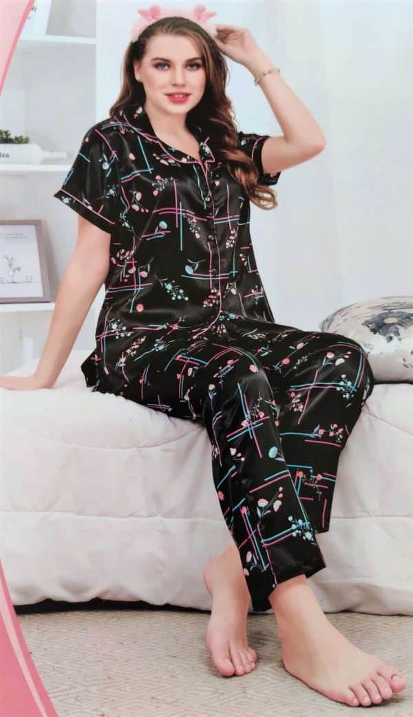 Arjey’s Women’s Satin Printed Night Suit Set of Half sleeves Shirt with Pajama – Black